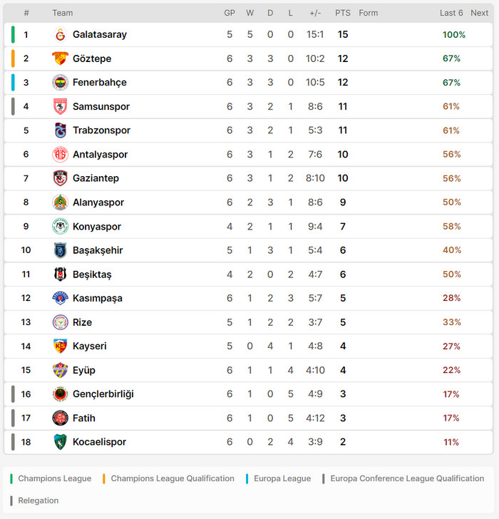 กาลาตาซารายกลับมาลงสนามในซูเปอร์ลีกอีกครั้งหลังจากเพิ่งเผชิญฝันร้ายในเวทียุโรปพ่ายแพ้ไอน์ทรัค แฟร้งค์เฟิร์ต ถึง 1-5 แม้จะเป็นฝ่ายออกนำก่อนก็ตาม อย่างไรก็ดีทีมของโอกาน บูรัค ต้องรีบสลัดความผิดหวังและหันมามุ่งสมาธิในลีกที่ยังโชว์ฟอร์มได้อย่างแข็งแกร่งเก็บชัยชนะ 5 นัดรวด ยิงไป 15 ประตู เสียเพียงลูกเดียว กลายเป็นทีมเดียวในลีกที่ยังมีสถิติสมบูรณ์แบบ จุดแข็งอยู่ที่ทั้งเกมรุกและเกมรับที่สมดุล