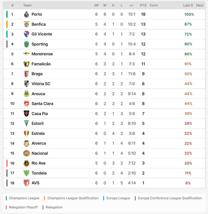 สปอร์ติ้ง ลิสบอนกลับมาสู่เกมลีกหลังเพิ่งโชว์ฟอร์มแกร่งในแชมเปี้ยนส์ ลีก ถล่มไคแร็ต อัลมาตี้ 4-1 โดยมี ฟรานซิสโก ตรินเกา กดสองประตูช่วยทีมคว้าชัยเหนือคู่แข่งจากคาซัคสถานอย่างสบายใจ ฟอร์มช่วงออกสตาร์ทถือว่าดูดีมากชนะถึง 5 จาก 6 เกมแรกมีเพียงการพ่ายต่อปอร์โต้ 1-2 ที่เป็นรอยด่างเพียงจุดเดียวจากฟอร์มที่กำลังร้อนแรงในเดือนที่ผ่านมา
