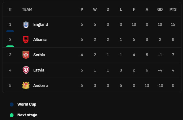 ทีมชาติ แอลเบเนีย เริ่มต้นเส้นทางคัดบอลโลกได้อย่างยากลำบากหลังออกไปแพ้ อังกฤษ 0-2 ที่เวมบลีย์ในเกมแรกซึ่งถือเป็นผลการแข่งขันที่ไม่น่าแปลกใจนัก แต่หลังจากนั้นพวกเขากลับมาทำผลงานได้ดีต่อเนื่องไม่แพ้ใคร 4 นัดติดเก็บได้ 8 คะแนนทำให้ขยับขึ้นมารั้งอันดับ 2 ของกลุ่มเค เหนือ เซอร์เบีย 1 คะแนน แม้จะแข่งมากกว่า 1 นัดก็ตาม