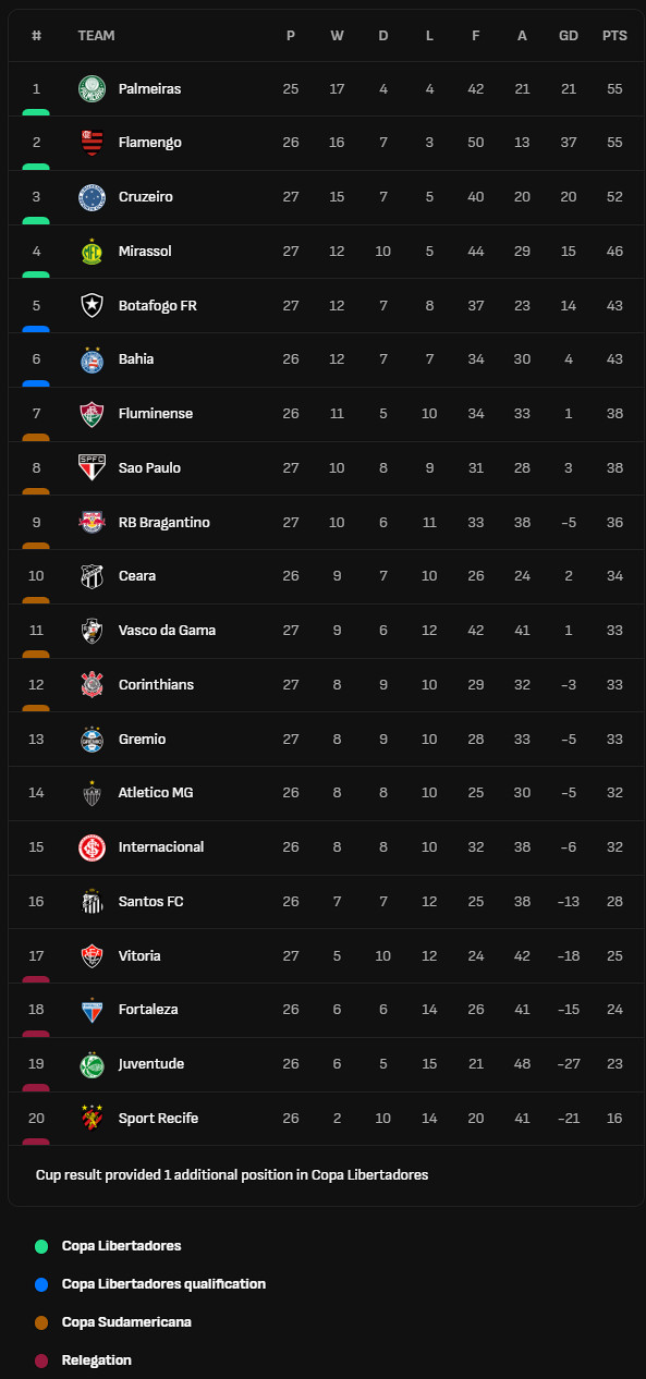 29/09/25 แพ้ บาเฮีย 0-1 (เยือน) บราซิล ซีรี่ เอ