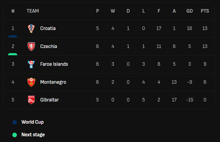 ทีมชาติโครเอเชียเริ่มต้นเส้นทางลุยศึกคัดบอลโลก 2026 ได้อย่างสมบูรณ์แบบด้วยการเก็บชัยรวด 4 นัดแรกก่อนที่ฟอร์มจะสะดุดเล็กน้อยเมื่อบุกไปเสมอกับเช็ก 0-0 แต่ผลงานโดยรวมยังถือว่ายอดเยี่ยมเก็บไปแล้ว 13 คะแนนจาก 5 นัดรั้งจ่าฝูงของกลุ่มร่วมกับเช็กแต่แข่งน้อยกว่าหนึ่งนัดซึ่งถือเป็นแต้มต่อสำคัญในการลุ้นแชมป์กลุ่มและตั๋วตรงไปฟุตบอลโลก