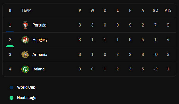 ทีมชาติโปรตุเกสยังคงแสดงให้เห็นถึงความแข็งแกร่งและความเฉียบคมในแนวรุก โดยเก็บชัยชนะได้ทุกนัดจาก 3 เกมแรกของศึกคัดบอลโลก 2026 ทำให้พวกเขาเข้าใกล้การผ่านเข้ารอบสุดท้ายเป็นสมัยที่ 8 ติดต่อกันเข้าไปทุกที แม้ในเกมล่าสุดจะต้องเหนื่อยไม่น้อยกว่าจะเฉือนชนะไอร์แลนด์ 1-0 จากประตูชัยของ รูเบน เนเวส นาทีที่ 91 หลัง คริสเตียโน่ โรนัลโด้ พลาดจุดโทษไปก่อนหน้านั้น